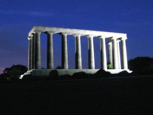 Romantika pokračuje, posuďte sami. Hřbitůvek...vzadu Calton Hill s památníky Edinburgh Castle v noci Památník na Calton Hill a výhled na noční město Městská hvězdárna a opět památník Památníky ještě jednou