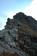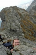 Cesta na Pachol'u je podle očekávání docela drsná. Za prvé ten kopec vypadá strašlivě vysoký a za druhé cesta k němu vede přes úzké strmé hřebeny, bloky kamenů, suťoviště i řetězy, takže si hrajeme na opičky a lezeme občas i po rukou. Při některých přelezech se dostáváme do tak krkolomných pozic, že by nám lecjaký gymnasta mohl závidět. Vůbec se neohlížím na to, jak směšně občas asi vypadám, důležité je nespadnout :).